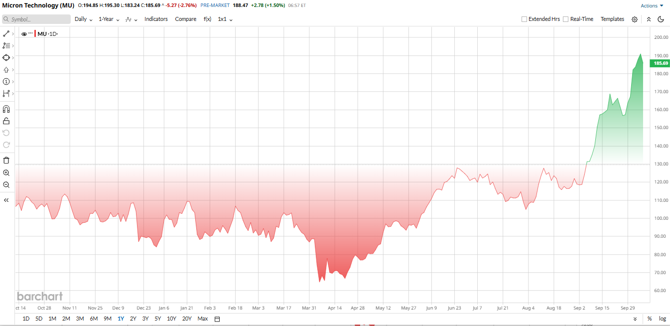 Micron has been one of 2025’s standout performers, more than doubling in price so far this year. The surge reflects booming demand for DRAM and high-bandwidth memory (HBM) to power AI data centers, coupled with tight supply. As Morgan Stanley noted in early October, “conviction from our purchasing contacts is very high,” saying it “sees more room to run.” In short, major tech trends, from Nvidia's (NVDA) and AMD's (AMD) AI chip launches to hyperscaler restocking, are fueling Micron’s rally.