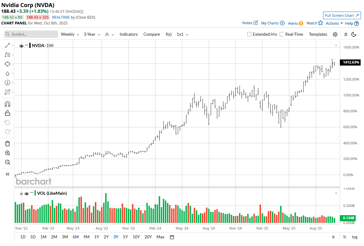 For investors seeking safety amid the AI frenzy, Nvidia (NVDA) stands out among the Magnificent 7. Over the last three years, Nvidia's stock has increased by 1,400%. Despite these outsized gains, NVDA stock trades at a reasonable forward price-to-earnings (P/E) multiple of 32.5x, which is above the 10-year average of 36.7x.
