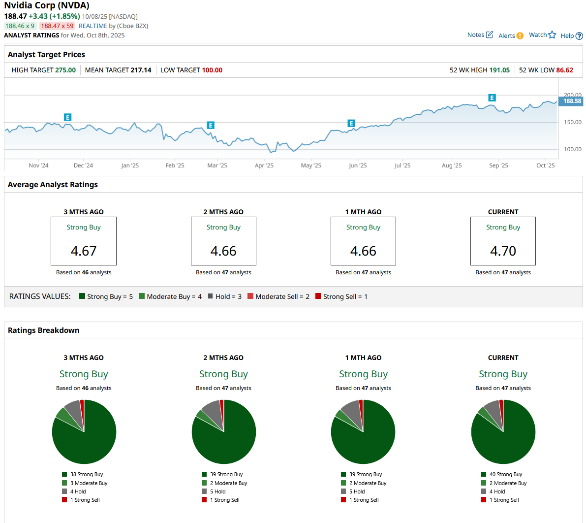 If NVDA stock is priced at 30x forward earnings, it could gain around 90% within the next four years. Out of the 47 analysts covering NVDA stock, 40 recommend “Strong Buy,” two recommend “Moderate Buy,” four recommend “Hold,” and one recommends “Strong Sell.” The average NVDA stock price target is $217, above the current price of $188.