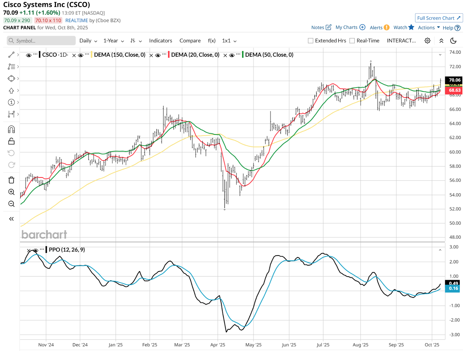 Cisco Systems (CSCO) is another stock I’m watching closely. It has some similarities to the BA chart above. However, CSCO’s PPO has just crossed into positive territory. The move higher has a chance to stall at the recent high just above $72, but as I see it, if I have a trade where the first few percentage points higher do occur, I just gave myself a ton of flexibility.
